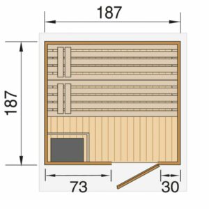 Turku 2 finn szauna szaunakályhával együtt 245 x 195 cm-es méretben, 45mm vastag gerendavázzal. Weka finn szauna építés.