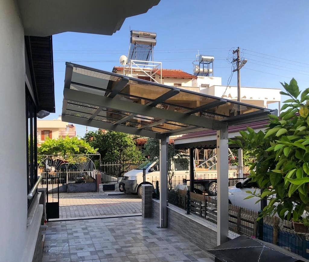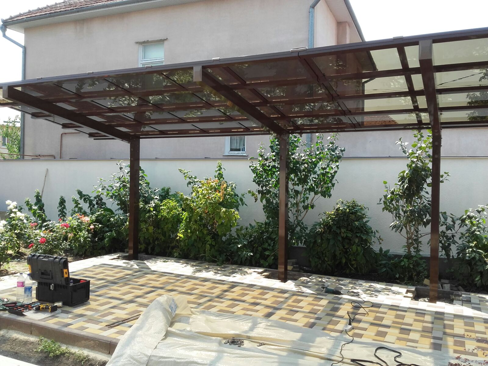- Fém garázstető építés előregyártott kész autóbeálló elemekből, polikarbonát tetőfedéssel együtt.