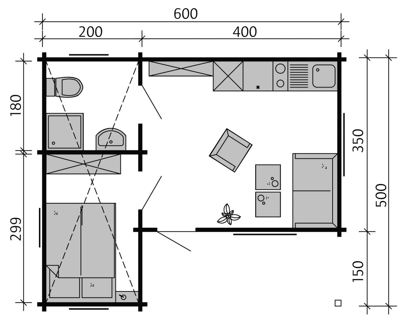- A 600 x 500 cm-es alapozási méretből 150 x 400 cm a fedett terasz, lásd részletes műszaki dokumentáció