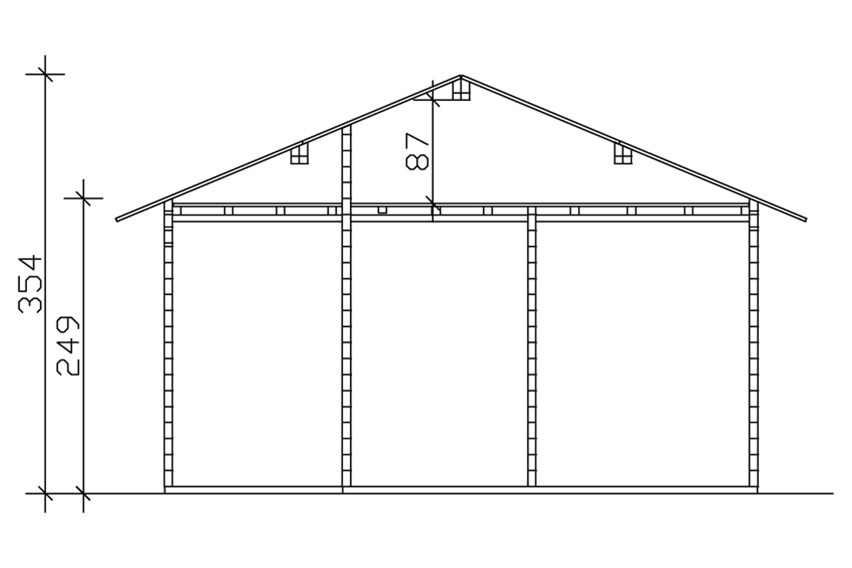 - Kész faház gerincmagassága 348 cm; Hétvégiház oldalfal magassága 249 cm / mindkét falvastagság esetén