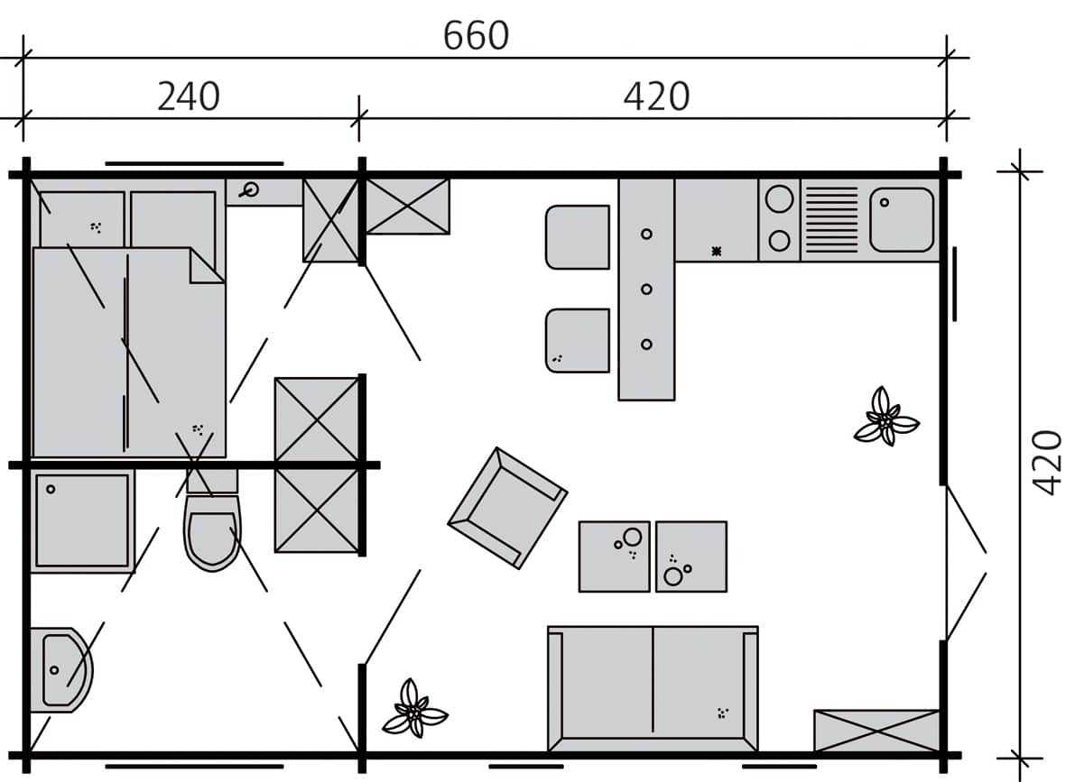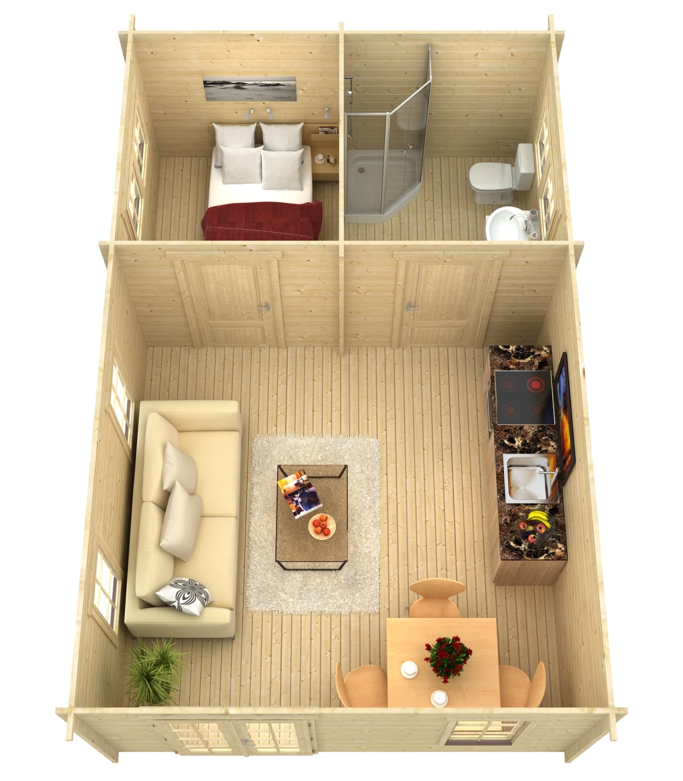 Faház hétvégi gerendaház Bern 4. 420 x 660 cm; 27,72 m2; hőszigetelt nyílászáró üvegezéssel !