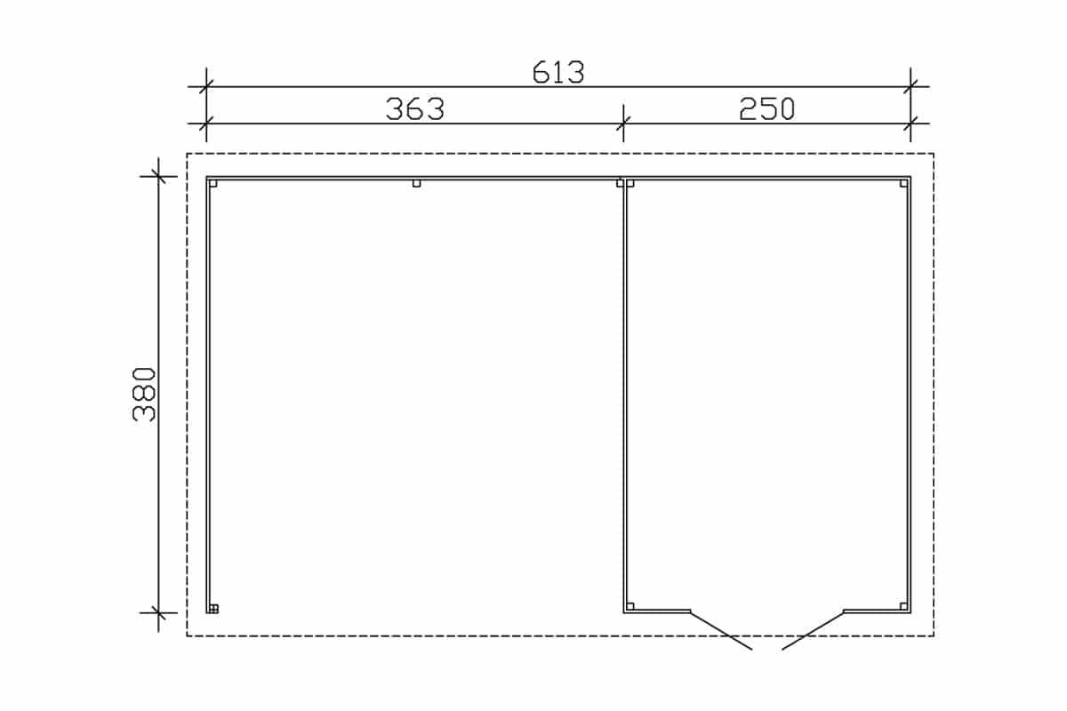 - Kerti faház terasszal 613 x 380 cm alapozási méretben; 28 mm oldalfalakkal