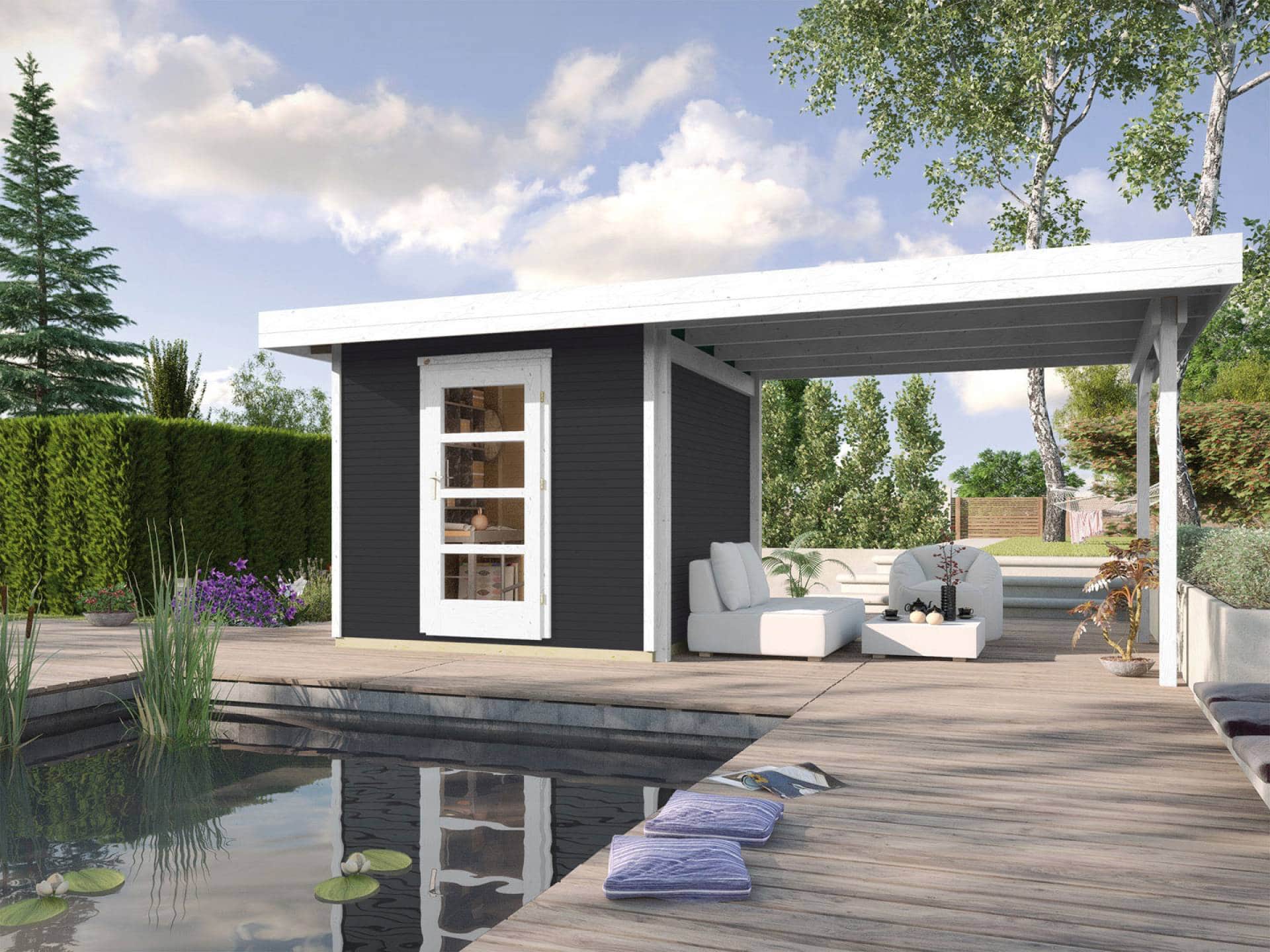 Kész kerti ház 2 méretben 235 x 241 cm vagy 295 x 300 cm alapozási méretben és 2 féle színben rendelhető + 300 cm-es oldalsó terasztetővel, hátfal nélkül.