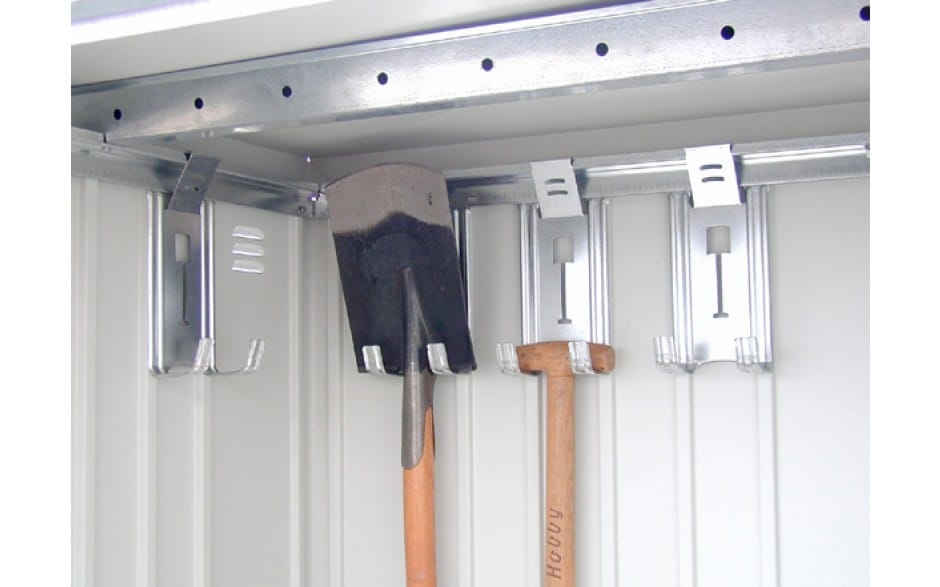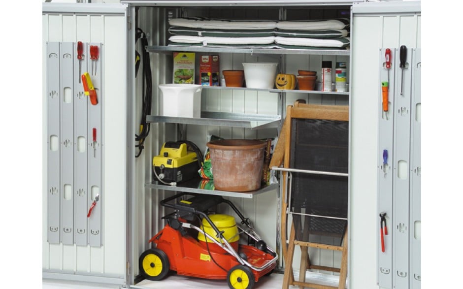 ALAP TARTOZÉKOK: 2 db polc (fotó szerint) alap tartozék + 4 db eszköztartó ásó, gereblye vagy tömlő praktikus tárolásához + az ajtókra szerelt rendszerező 6 db akasztókampóval együtt, valamint a nemesacél cilinderzár pótkulccsal.