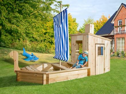 - Natúr északi fenyő faelemekből épített homokozó hajó kajüttel együtt