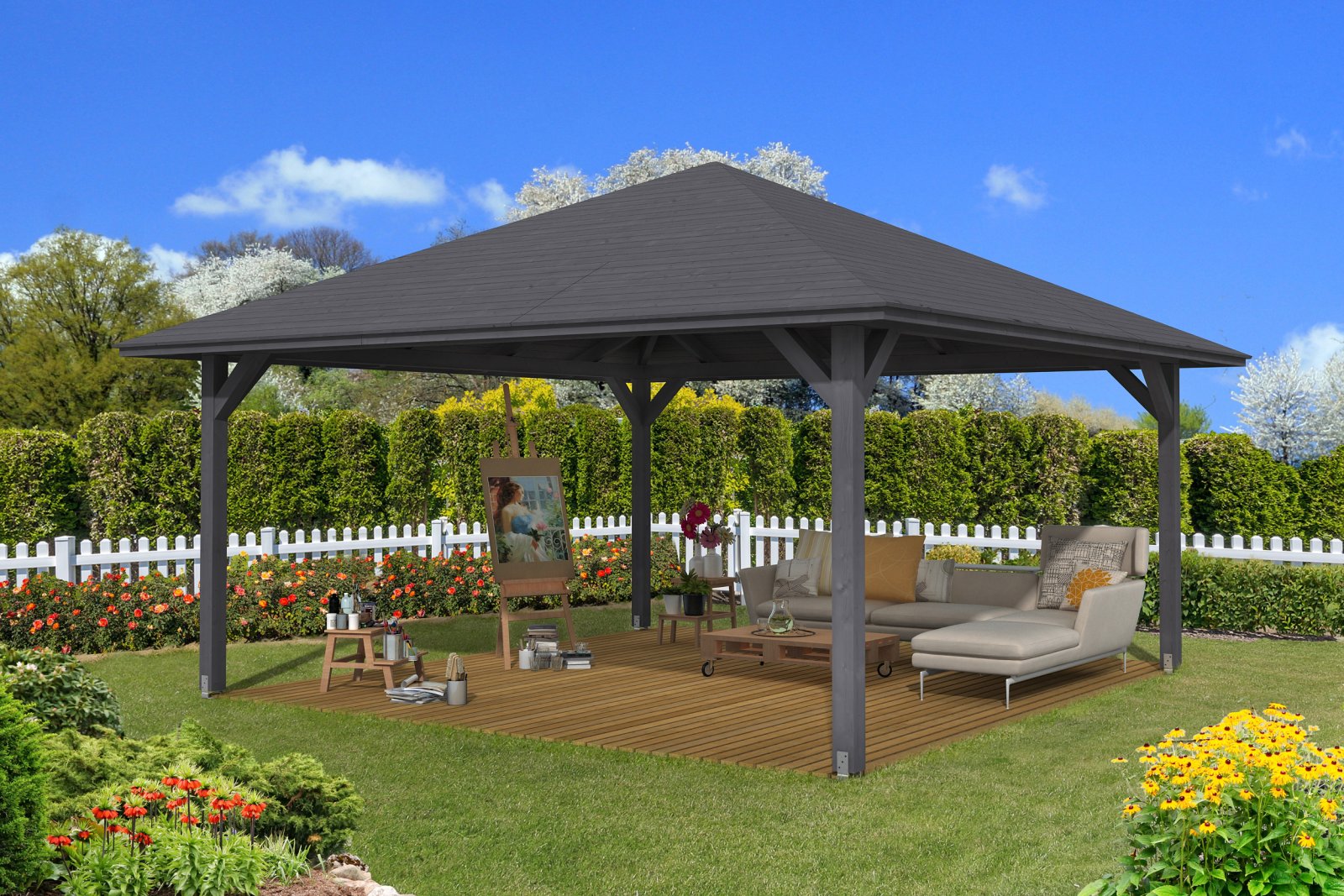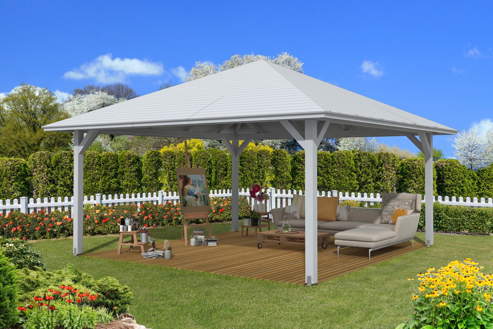 - Talapzatméret a választott pavilon méretétől függően 270 x 270 cm vagy 335 x 335 cm vagy 400 x 400 cm illetve 465 x 465 cm (pillérek által határolt felület eresz túllógások nélkül)