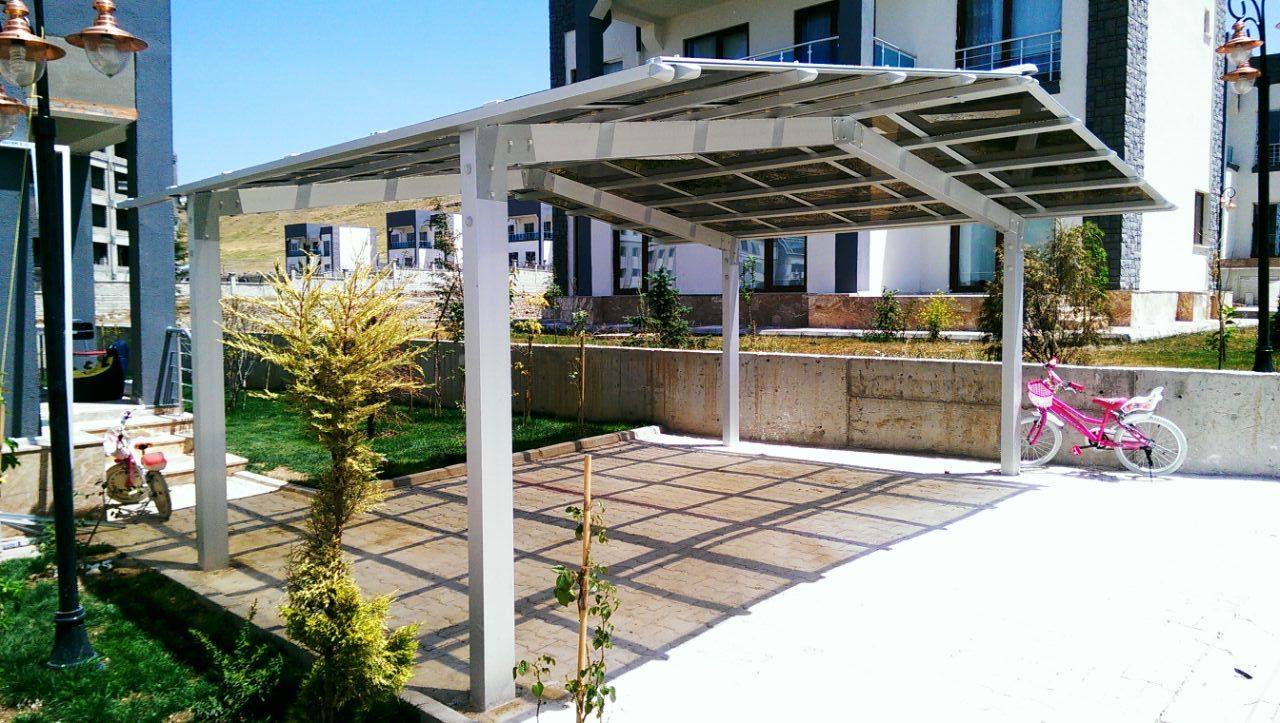 - Kétállásos fém garázstető építés előregyártott kész autóbeálló elemekből, polikarbonát tetőfedéssel együtt.