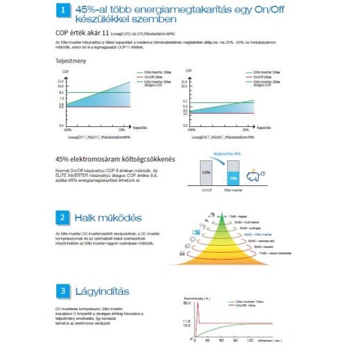 Az inverterrendszer optimális beállításával a hűtőközeg (gáz) áramlási sebességének szabályozására kevesebb áramot fogyaszt. Az Elite Inverter precíz hőmérséklet-szabályozással rendelkezik. Amikor a medence hőmérséklete közelít a beállított értékhez, alacsonyabb sebességre vált a hőszivattyú, ami nagyobb hatékonyságot (C.O.P) és csendesebb működést biztosít.