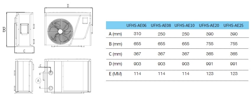 Hőszivattyú méretei (mm): A: 250, B:655,  C:367,  D:903,  /bekötési magasság E:114 mm /