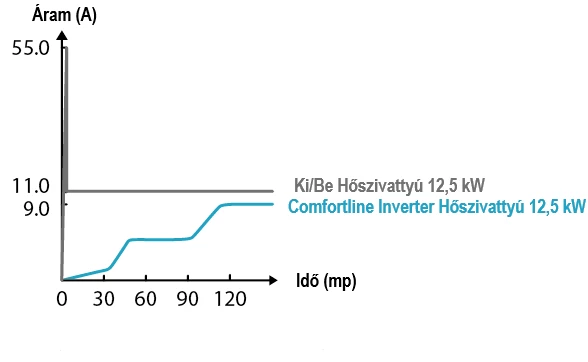 Amikor a Comfortline Inverter medencefűtés bekapcsol, az áramfelvétele 0 A-tól egyenletesen növekszik, amíg el nem éri a névleges áramfelvétel értékét kb. 2 perc alatt. Ez nem terheli meg otthona villamosenergia-rendszerét. Ezzel szemben a Be/Ki üzemű hőszivattyú gyakori indítási áramfelvétele a névleges áram ötszöröse, ami terhet jelent a villamosenergia-rendszer számára.