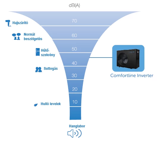 A csendes DC-inverter kompresszornak, a kompresszor és a ventilátormotor alacsony fordulatszámú működési elvének köszönhetően a Comfortline Inverter medence hőszivattyú szupercsendes működést kínál 7dB (A) alacsonyabb hangnyomás mellett, ÁTLAG 50% -os kapacitásnál.