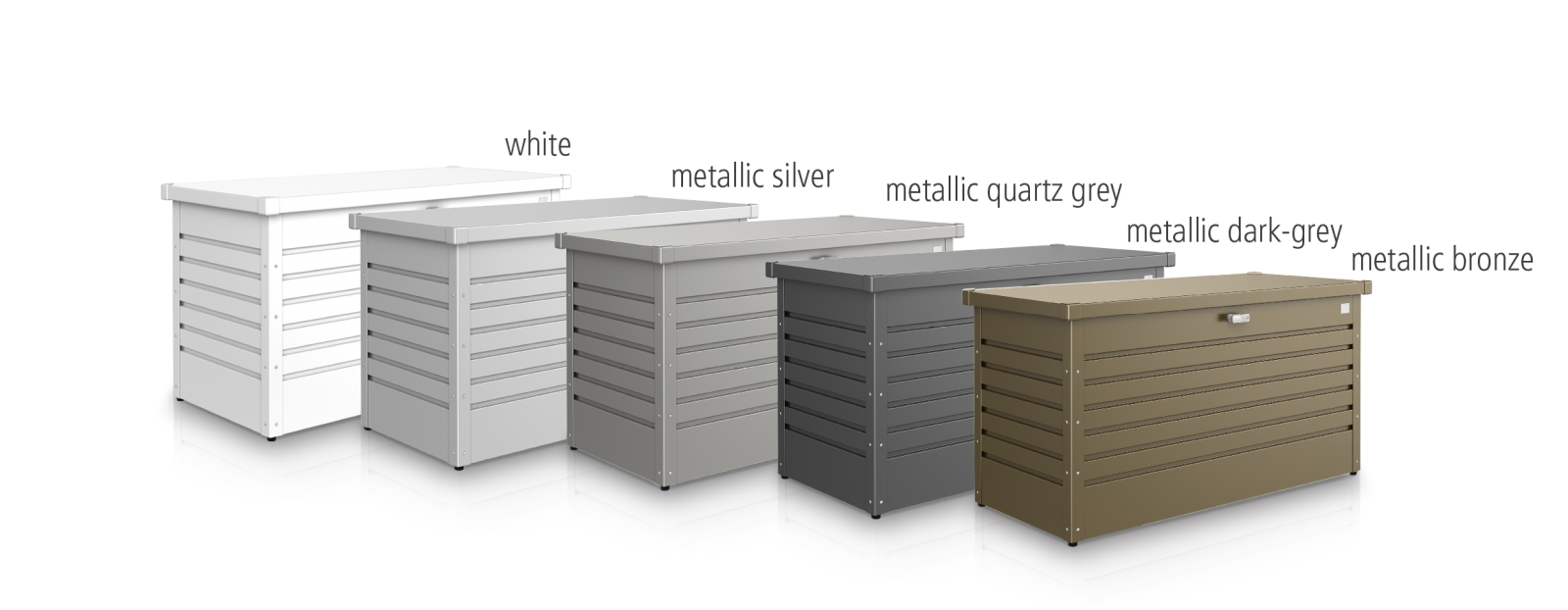 Biohort fém párnatartó láda FreizetBox 5 méretben. Prémium fém kerti tároló teraszokra és medence mellé.