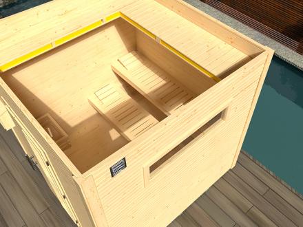 Kuopio szaunaház belső kialakítása: 2 db 55 cm széles szauna fekvő pad, szauna védőrács + kivehető szauna padlórács 60 x 90 cm-es méretben + 2 db fejtámla is az alap ajánlat részét képezi.