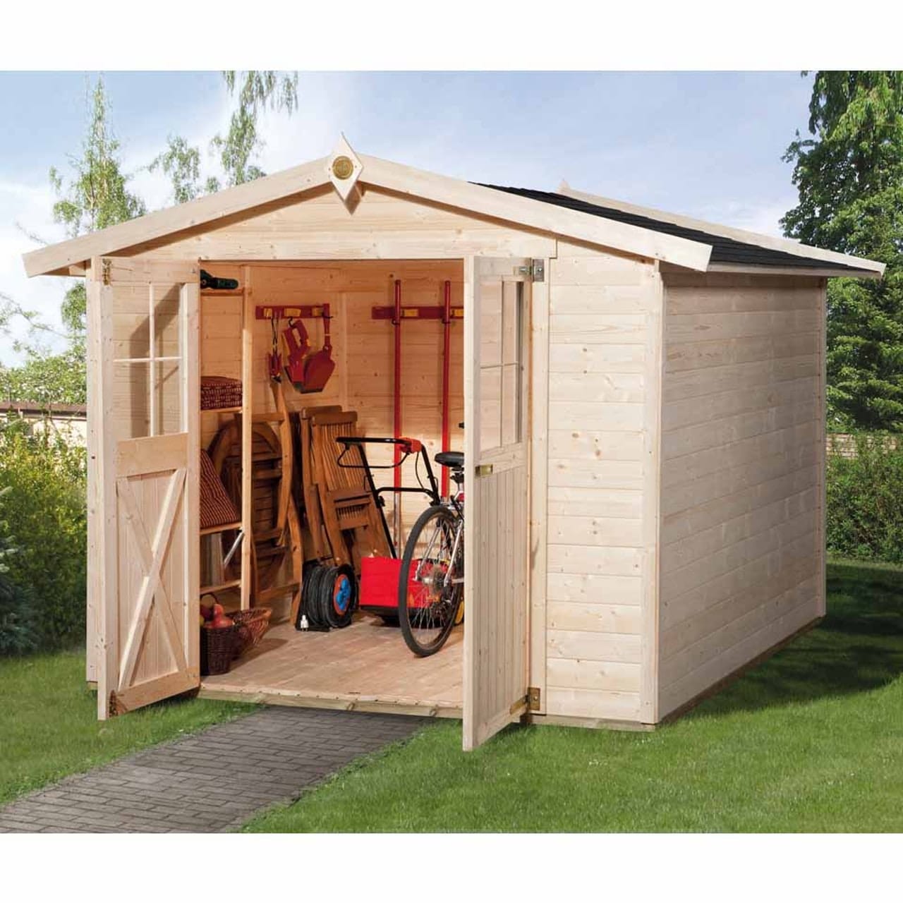 - 316-os Weka szerszámtároló faház kétszárnyú ajtóval, szerszámos ház külső sarokmérete/alapozási mérete: a fenti fotó melletti választó gombbal adható meg a kívánt méretben: 152 x 148 cm- mérettől 198 x 148 cm; 198 x 194 cm ; 254 x 194 cm és 254 x 250 cm és 254 x 295 cm alapozási méretig rendelhető padlózattal együtt