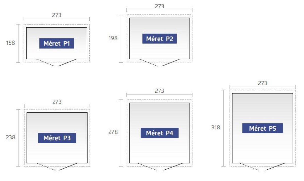 | Méret | P1 (273 x 158 cm), P2 (273 x 198 cm), P3 (273 x 238 cm), P4 (273 x 278 cm), P5 (273 x 318 cm) |